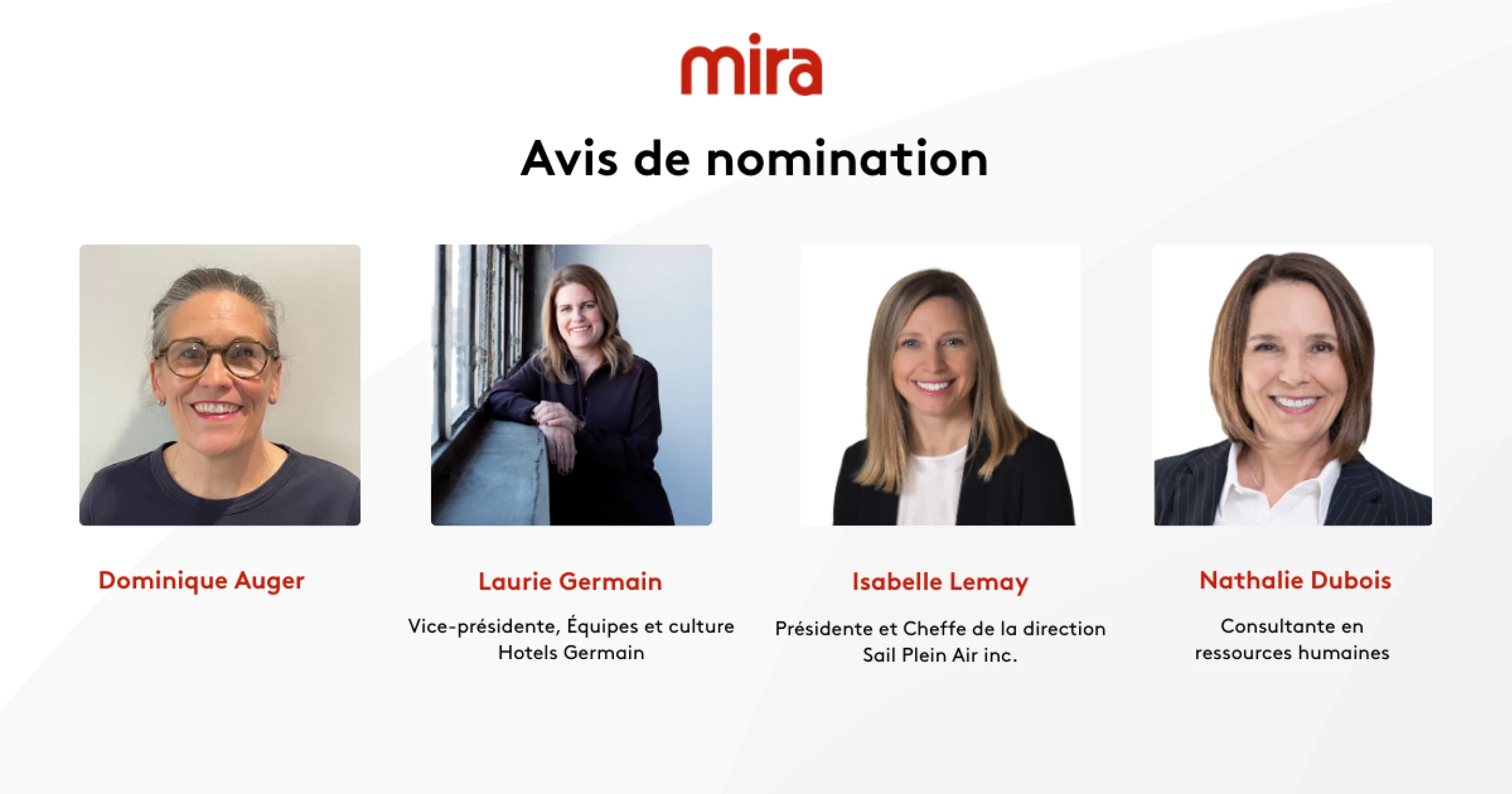 Mira est fière d’annoncer la nomination de Dominique Auger, Laurie Germain, Isabelle Lemay et Nathalie Dubois au sein de son conseil d’administration.