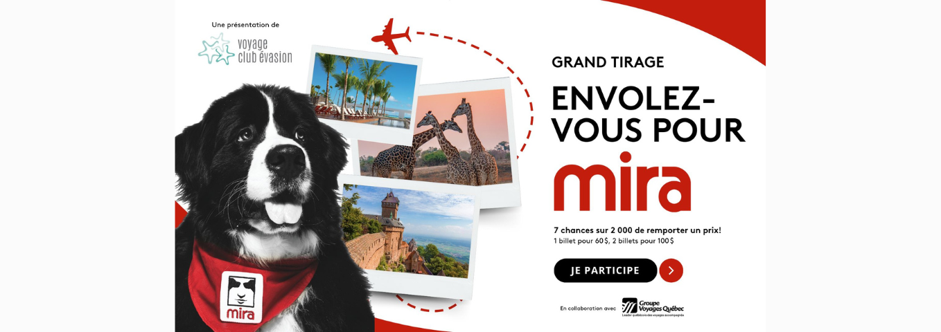 Le Grand Tirage Mira est l'occasion parfaite de contribuer à l'importante mission de Mira, tout en courant la chance de vous envoler vers une destination de rêve avec la personne de votre choix.